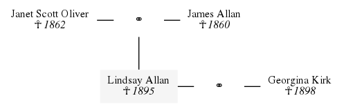 Lindsay Allan ♂ is born to James Allan ♂ and Janet Scott Oliver ♀.
